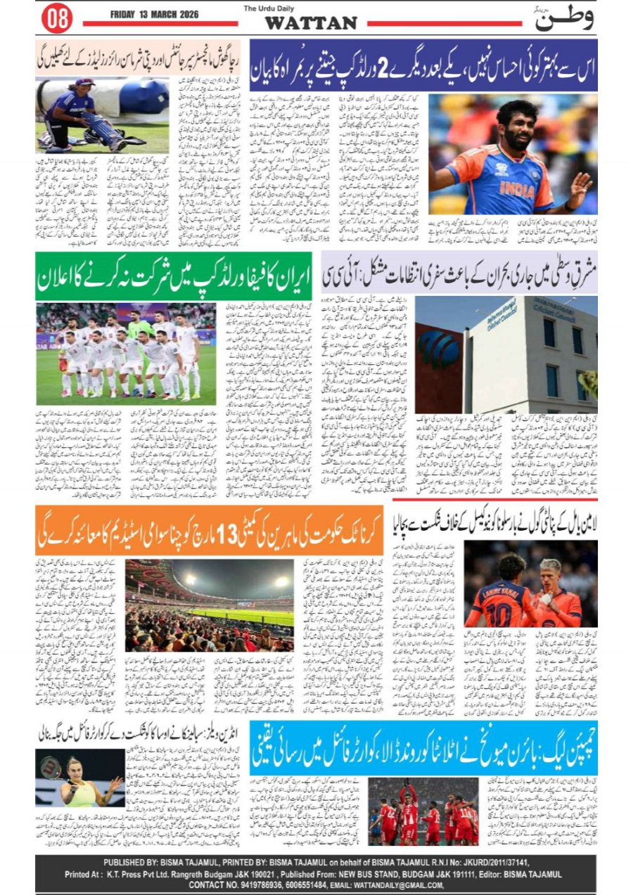 Wattan Daily 13 march Page: 8 March 13, 2026 8 Page 1Page 2Page 3Page 4Page 5Page 6Page 7Page 8 × Wattan Daily 13 march Wattan 13 March_1Wattan 13 March_2Wattan 13 March_3Wattan 13 March_4Wattan 13 March_5Wattan 13 March_6Wattan 13 March_7Wattan 13 March_8 Download PDF File << First << 8 >> Last >> Page no 1Page no 2Page no 3Page no 4Page no 5Page no 6Page no 7Page no 8
