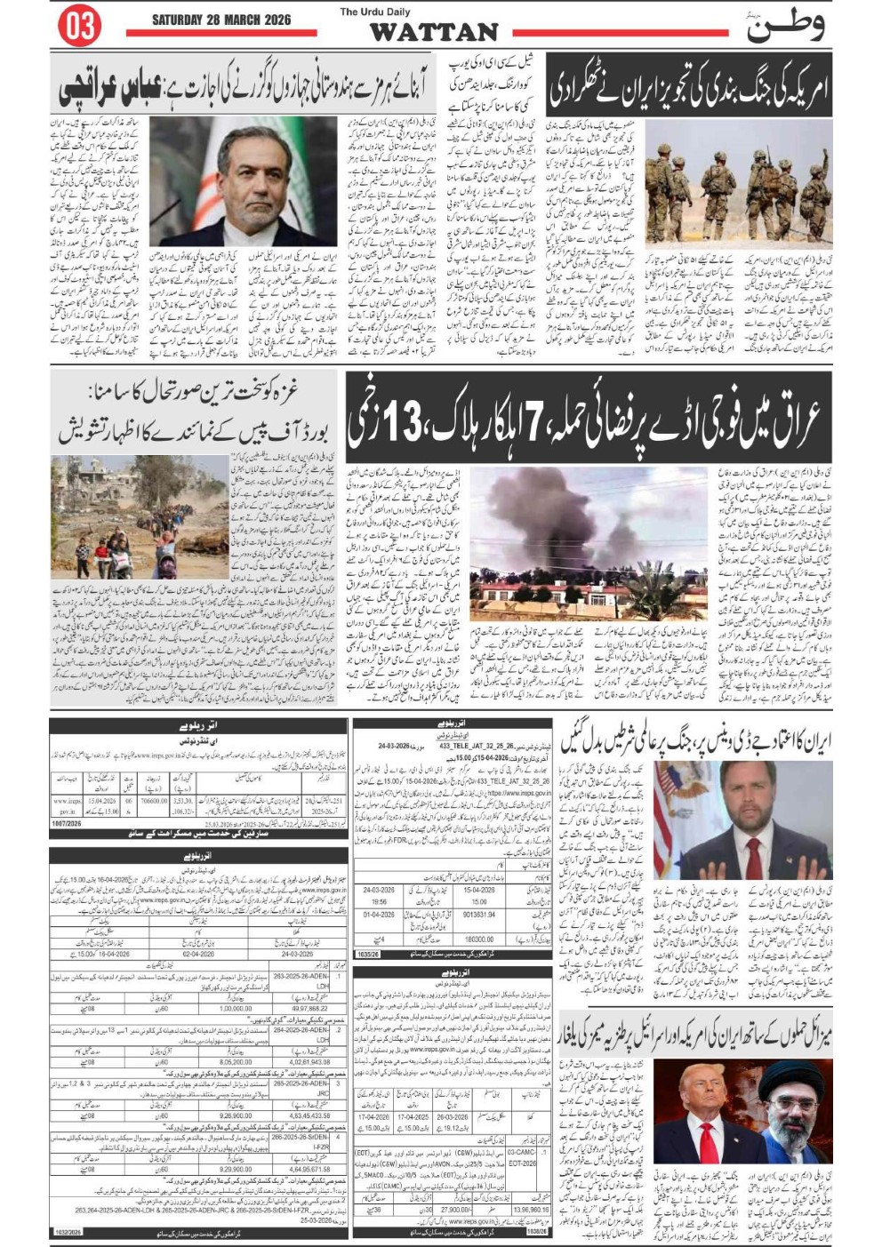 Wattan Daily 28 MARCH Page: 3 March 28, 2026 3 Page 1Page 2Page 3Page 4Page 5Page 6Page 7Page 8 × Wattan Daily 28 MARCH Watan 28 March_1Watan 28 March_2Watan 28 March_3Watan 28 March_4Watan 28 March_5Watan 28 March_6Watan 28 March_7Watan 28 March_8 Download PDF File << First << 3 >> Last >> Page no 1Page no 2Page no 3Page no 4Page no 5Page no 6Page no 7Page no 8