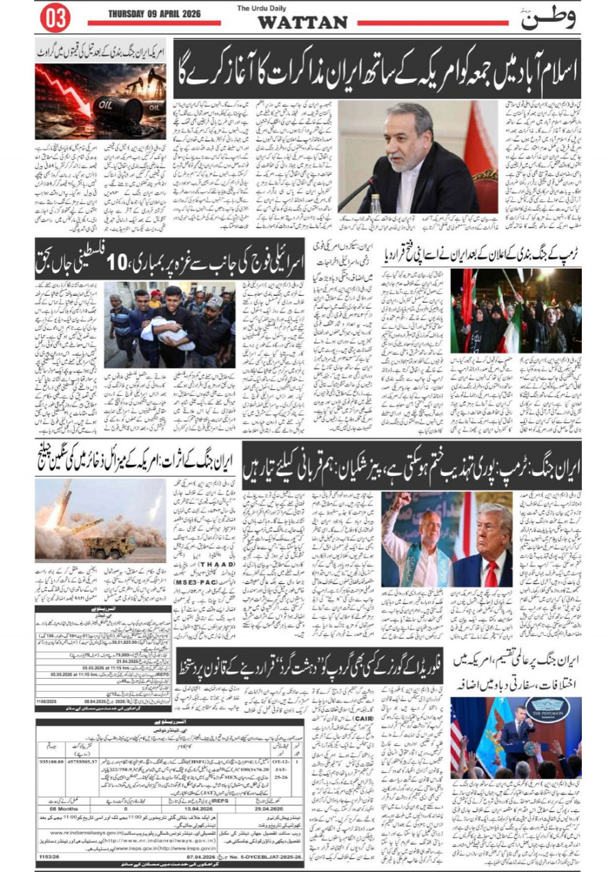 Wattan Daily 09 april Page: 3 April 09, 2026 3 Page 1Page 2Page 3Page 4Page 5Page 6Page 7Page 8 × Wattan Daily 09 april Wattan 09 April_1Wattan 09 April_2Wattan 09 April_3Wattan 09 April_4Wattan 09 April_5Wattan 09 April_6Wattan 09 April_7Wattan 09 April_8 Download PDF File << First << 3 >> Last >> Page no 1Page no 2Page no 3Page no 4Page no 5Page no 6Page no 7Page no 8